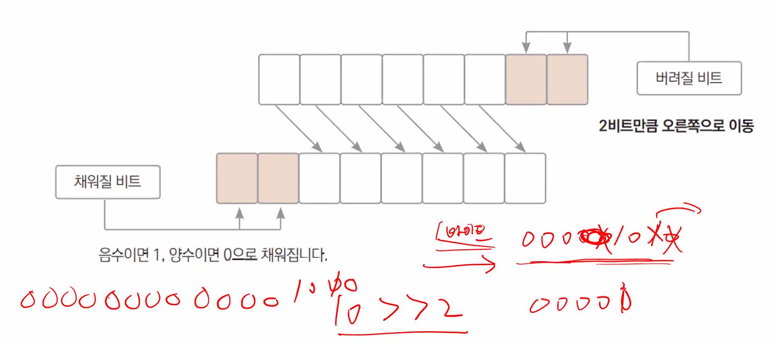 - 왼쪽 추가되는 비트는 부호의 값으로, 오른쪽으로 비트 이동시 부호가없는 정수이면 0, 음수이면 1이 채워집니다.