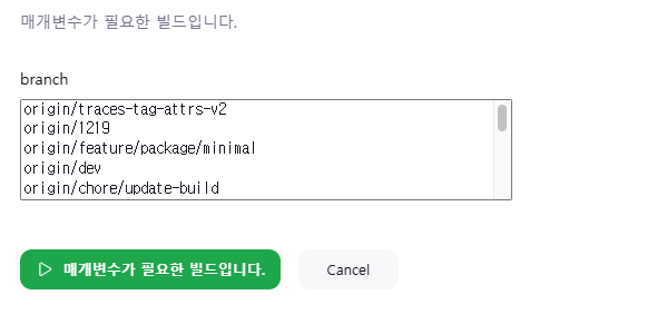 적용이 완료되면 해당 그림과 같이 branchName 목록이 나열이 되며, 만약에 매개변수를 클릭을 안할 경우 해당 부분은 위에 설정한 default값이 설정이 된다. 만약에 선택을 하게되면 설정한 def branch 에 해당 변수값이 들어가게되고 git clone시 해당 branch로 가져오게 된다.