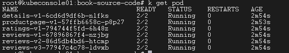 $ kubectl apply -f bookinfo.yaml배포가 완료되면 아래와같이 reviews -v1,v2,v3 외 3가지 application이 배포가 된 모습을 볼수 있다.